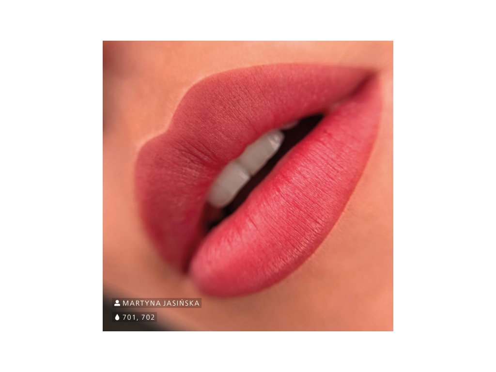 701 Wild Rose je elegantní růžová barva na rty s chladně tmavým podtónem. Může být použit pro všechny typy rtů a je ideální pro ty, kteří chtějí výraznou pigmentaci rtů. 701 Wild Rose se používá šetrně a ve spojení s jemnou pigmentační technikou vypadá jemně a růžově. Intenzivnějšího výsledku je tedy dosaženo díky většímu začlenění pigmentu.